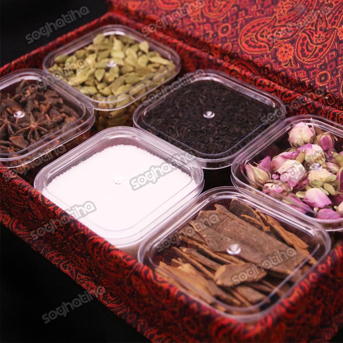 این هدیه خاص، شامل چای سیاه، شکر، غنچه گل سرخ، بادیان ستاره ای، دارچین قلم و هل می باشد که با توجه به بسته بندی سنتی نفیس و زیبای آن می تواند به عنوان هدیه ای خاص و یا به عنوان هدیه نوروز و هدیه عید و یا هدیه ای مناسب برای چای خورهای حرفه ای و علاقمندان به چای های خاص و متفاوت انتخاب شود .